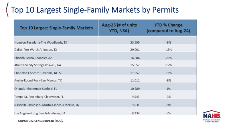 At the local level, below are the top ten metro areas that issued the highest number of single-family permits.