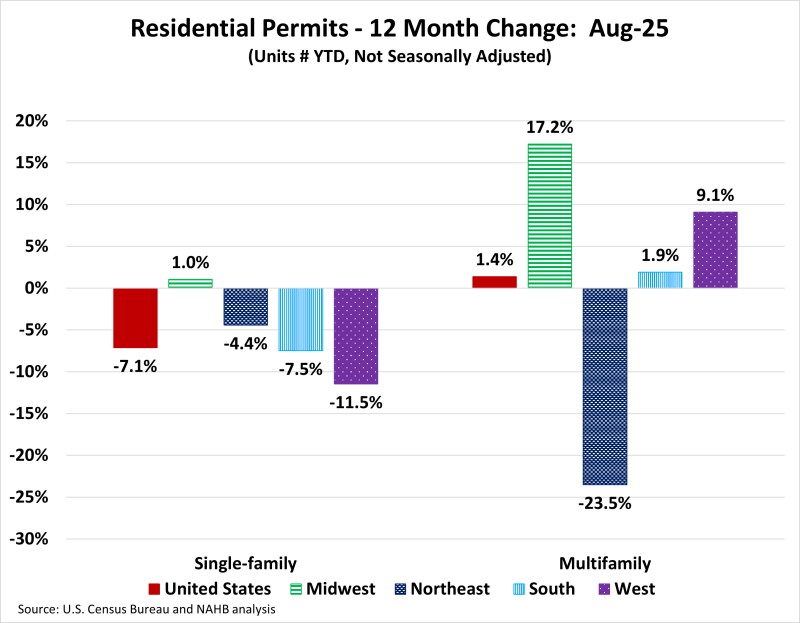 Year-to-date ending in August, single-family permits were up in one out of the four regions. The Midwest posted a minor increase of 1.0%. The Northeast was 4.4% lower, the South was down by 7.5%, and the West was down by 11.5% in single-family permits during this time. For multifamily permits, three out of the four regions posted increases. The Midwest was up by 17.2%, the West was up by 9.1%, and the South was up by 1.9%, Meanwhile, the Northeast declined steeply by 23.5%, driven by the New York-Newark-Jersey City, NY-NJ MSA which declined by 34.0%.