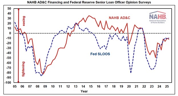 Paul Emrath2025-08-15T08:16:00-05:00For the fourteenth consecutive quarter, builders and developers reported tighter credit conditions on loans for residential Land Acquisition, Development & Construction (AD&C) in NAHB’s quarterly survey on AD&C Financing. In the second quarter of 2025, the NAHB survey’s net easing index posted a reading of -12.3 (the negative number indicating that credit tightened since the previous quarter). This is in reasonably close agreement with the second quarter reading of -9.7 for the similar net easing index derived from the Federal Reserve’s survey of senior loan officers. Like the NAHB net easing index, the one from the Fed has been in negative territory (indicating credit tightening) for fourteen consecutive quarters. Over the past year the additional tightening indicated by both indices has been relatively modest, with index levels hovering between -20 and 0. Modest or not, however, after fourteen straight quarters of tightening, many builders are probably wondering how much room lenders have left to tighten further. More details from the Fed’s survey of lenders—including measures of demand and net easing for residential mortgages—appeared in a previous post. According to NAHB builders, the most common ways lenders tightened credit on AD&C loans in the second quarter were by reducing the amount they are willing to lend (cited by 60% of the builders who reported tighter credit), requiring personal guarantees (53%), increasing the interest rate and not making new loans (47% each), and increasing documentation requirements (40%). Also in the second quarter, the cost of credit declined on loans made specifically for residential land acquisition (the “A” in AD&C). The average contract interest rate on the loans declined from 8.23% to 7.82%, while the average initial points dropped from 0.71% to 0.56%. As a result, the average effective interest rate (which takes both the contract rate and initial points into account) on land acquisition loans declined from 10.68% to 9.95%. For the other three categories of AD&C loans tracked in the NAHB survey, credit became more expensive since the previous quarter. The average contract interest rate increased on loans for land development (from 7.86% to 8.04%) and speculative single-family construction (from 8.08% to 8.17%), while declining only slightly (from 7.96% to 7.95%) on loans for pre-sold single-family construction. Meanwhile, average initial points were unchanged at 0.74% on loans for land development, but increased from 0.68% to 0.72% on loans for speculative single-family construction, and from 0.45% to 0.58% on loans for pre-sold single-family construction. Those combinations of quarter-to-quarter changes took the effective interest up from 11.50% to 11.77% on loans for land development, from 12.59% to 12.82% on loans for speculative single-family construction, and from 12.49% to 12.73% on loans for pre-sold single-family construction. Although the average effective interest rate was higher in 2025 Q2 than in 2025 Q1 for three of the four categories of AD&C loans, the rate was down year-over-year for all four. Financing costs for builders and developers could decline further over the next quarter, especially if (as NAHB expects) the Federal Reserve reduces the target federal funds rate at its September meeting. In fact, as discussed in NAHB’s post on the Fed’s July meeting, a reduction in construction financing costs rather than an effect on mortgage rates is the main benefit builders can expect from easier monetary policy. More detail on credit conditions for residential builders and developers is available on NAHB’s AD&C Financing Survey web page. Discover more from Eye On Housing Subscribe to get the latest posts sent to your email.