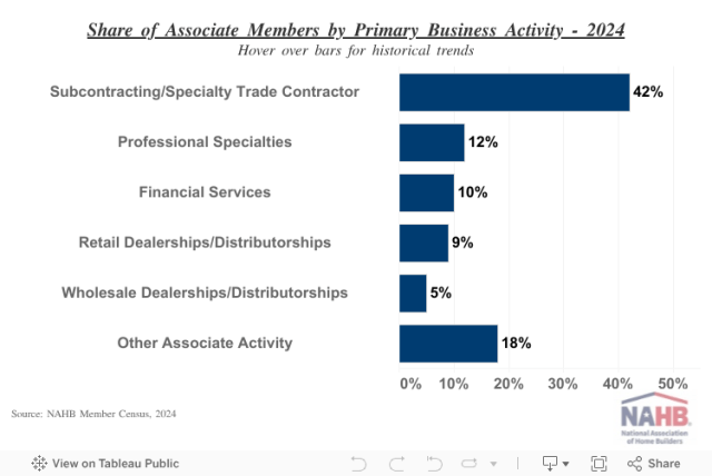 Eric Lynch2025-09-19T08:19:23-05:00Every year since 2008, the NAHB has conducted a member census in order to better understand the composition and characteristics of the people who belong to its organization. Similar to a previous post about builder members, NAHB conducted a related analysis of its associate members. In 2024, 65% of NAHB’s members were associate members—those involved in a wide range of support industries and professions including, among others, trade contractors, manufacturers, retailers/distributors, designers, and architects. Of the 71,170 associate members, 42% are primarily subcontractor/specialty trade contractors, 12% have a professional specialty, 10% are in financial services, 9% are retail dealerships or distributorships, 5% are wholesale dealerships or distributorships, and the remaining 18% have some other type of primary activity. In 2024, associate members had a median of 12 employees on payroll, which has been unchanged since 2022. Twenty-three percent of associate members had 1-4 employees, 19% had 5 to 9, 37% (plurality) had 10 to 49, and 19% had 50 or more employees. Two percent had no payroll at all. The median revenue of NAHB associate members was $3.02 million in 2024, a slight increase from $3.00 million in 2023 and the highest in the 17-year history of the Census. In 2024, the median age of NAHB associate members was 56 which has remained constant since 2022. Four percent of associate members were less than 35 years old, 16% were 35 to 44, 25% were 45 to 54, 34% (plurality) were 55 to 64, and 20% were 65 or older. The share of associate members who identify as female stands at 25%, up one percentage point from 2023. For more details about NAHB associate members and a profile of each type of member, please visit housingeconomics.com or click here for the full article. Discover more from Eye On Housing Subscribe to get the latest posts sent to your email.