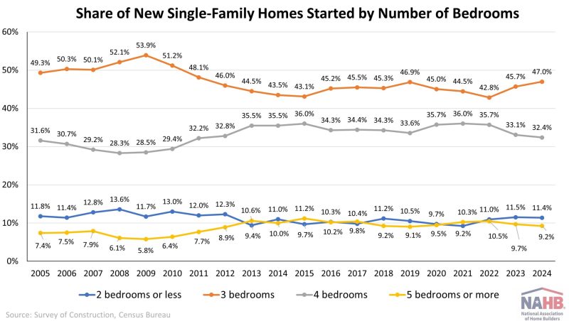 Jesse Wade2025-11-05T09:15:33-06:00Three-bedroom single-family homes reached their largest share of starts since 2011 and remained the most prevalent number of bedrooms among new homes. The share of starts for four-bedroom homes declined for the third consecutive year but remained well above the shares for two-bedroom or less and five-bedroom or more homes. The share of single-family homes started with three bedrooms rose for the second straight year to its highest level since 2011 to 47.0%. All other bedroom number categories fell from 2023, with 4-bedroom homes falling the most from 33.1% to 32.4%, a 0.7 percentage point decline from the year prior. The share of single-family homes with 2 bedrooms or less remained greater than that of 5 bedrooms or more for the third straight year. U.S. Divisions Across U.S. Census Divisions, the share of new single-family homes with four or more bedrooms displays geographic variation. The share ranged from a low of 22.2% in the New England division to the highest share of 46.7% in the West South Central division. Coinciding with the fall in the share of new single-family homes with 4 bedrooms or more nationally, there are no divisions that have a share above 50%. Purpose of Construction The number of bedrooms in new homes varies depending on the purpose of construction (built-for-sale, contractor-built, owner-built, built-for-rent). Most of this variation comes from the two-bedroom or less homes and four-bedrooms homes. For example, the share of new single-family homes with two bedrooms or less ranges from 5.6% of homes built-for-sale to 37.8% of homes built-for-rent. Meanwhile, three-bedroom homes and five or more-bedroom homes display relatively little change across purpose of construction. Five or more-bedrooms homes held the smallest share of starts across purpose of construction for all types except for built-for-sale homes. Discover more from Eye On Housing Subscribe to get the latest posts sent to your email.
