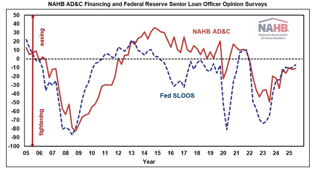 Jesse Wade2025-12-02T09:19:00-06:00Single-family construction lending picked up in the third quarter, amidst the overall cooling lending environment. Loan balances for 1-4 family construction grew to $91.2 billion in the third quarter, registering the first annual increase in over two years. However, across all acquisition, development and construction (AD&C) loans, the total volume fell for the seventh straight quarter. According to data from the Federal Deposit Insurance Corporation (FDIC), the total level of outstanding AD&C loans fell to $463.0 billion in the third quarter of 2025, down 5.6% from one year ago. This year-over-year decrease was led by a drop in other real estate development loans, which decreased 7% over the year to $371.8 billion. Meanwhile, the volume of 1-4 family residential construction and land development loans rose to $91.2 billion in the third quarter, up 0.5% from one year ago. It is worth noting, the FDIC data represent only the stock of loans, not changes in the underlying flows, so it is an imperfect data source. Nonetheless, lending remains much reduced from years past. The current amount of existing 1-4 family residential AD&C loans now stands 56% lower than the peak level of residential construction lending of $204 billion reached during the first quarter of 2008. Alternative sources of financing, including equity partners, have supplemented this capital market in recent years. Quality Metrics of Construction Loans While the total volume of 1-4 family residential construction loans rose, the volume of loans 30+ days past due or nonaccrual status fell slightly to $1.1 billion over the quarter. As a share of the total 1-4 family residential construction loan volume, this accounts for 1.2%. Breaking this out further, the level of loans 30-89 days past due was $418.1 million, while the volume in nonaccrual status was $593.4 million. The nonaccrual loan status volume increased from $572.4 million in the second quarter and the 30-89 past due fell from $469.2 million. Loans are classified as nonaccrual when one or more of the following conditions apply: the loan is 90 days or more past due on principal or interest (unless it is well-secured and in the process of collection); the bank no longer expects full repayment of principal and interest; or the borrower’s financial condition has significantly deteriorated, warranting cash-basis accounting.
