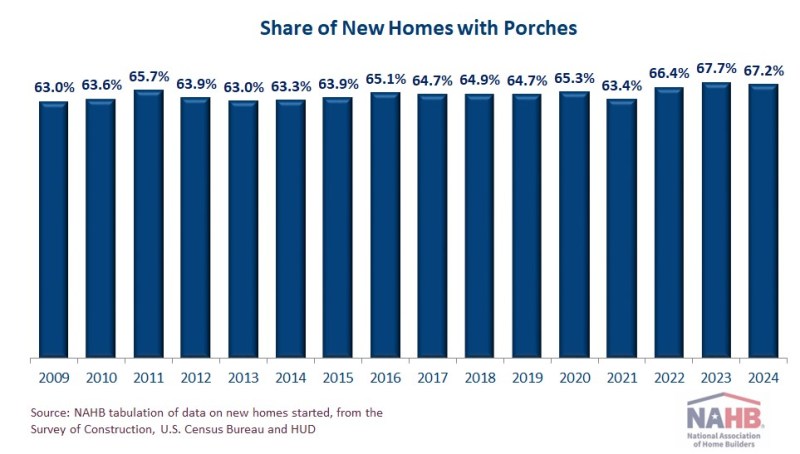 Paul Emrath2025-10-22T11:16:10-05:00Although the share of new homes with porches edged down in 2024, porches continue to rank as the most common outdoor feature on new homes, according to NAHB tabulation of the latest data from the Survey of Construction (SOC, conducted by the U.S. Census Bureau with partial funding from HUD). Of the roughly 1.0 million single-family homes started in 2024, the SOC data show that 67.2% were built with porches. This is down, but only slightly, from the all-time peak of 67.7% reported a year earlier. Porches also continue to be more common on new homes than the other outdoor features covered in the SOC: patios and, especially, decks. Traditionally, porches on new homes have been most common in the four states that make up the East South Central Census division. That was true again in 2024, although only by a narrow margin. In 2024, 81% of new homes in the East South Central had porches, but this share was well over 70% in three other divisions: the Pacific (78%), Mountain (77%), and South Atlantic (74%) divisions. Compared to the 2023 numbers reported in last year’s post, the porch percentages were up by two points in the East and West South Central divisions, unchanged in the Mountain and South Atlantic divisions, and down at least slightly in the other five divisions. Detail about the characteristics of porches on new homes is available from the Builder Practices Survey (BPS), conducted annually by Home Innovation Research Labs. Among other things, the 2025 BPS report (based on homes built in 2024) shows that porches continue to be far more common on the front of new single-family homes than on the side or rear. When on the front, porches average approximately 100 square feet of floor area. The other categories of porches distinguished in the SOC, although comparatively rare, tend to be noticeably larger: 140 square feet for a side or rear porch, and just over 200 square feet for a screened-in porch. On a square foot basis, builders continue to use concrete more than any other material to build new-home porches. Only one division remains a clear outlier in this regard. In New England, builders seldom use concrete in new-home porches, instead most often building them out of composite (a blend of usually recycled wood fibers and plastic). In that division, they also use treated wood, PVC or other plastics, cedar, and natural stone more often than concrete. Discover more from Eye On Housing Subscribe to get the latest posts sent to your email.