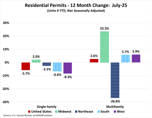 Na Zhao2025-11-17T11:14:28-06:00Private residential construction spending inched up 0.8% in August, continuing steady growth since June 2025. This modest increase was primarily driven by more spending on multifamily construction and home improvements. However, total spending was 2% lower than a year ago, as the housing sector continues to navigate the economic uncertainty stemming from ongoing tariff concerns and elevated mortgage rates. According to the latest U.S. Census construction spending data, single-family construction spending slipped 0.4% in August, in line with the soft builder sentiment reflected in the August NAHB/Wells Fargo Housing Market Index (HMI). Compared to a year ago, single-family construction spending decreased by 1.1%. Improvement spending (remodeling) posted a solid 8.2% gain for the month, but it remained 1.3% lower than in August 2024. The remodeling sector continues to show resilience, supported by strong homeowner equity and persistent demand for home improvements. Meanwhile, multifamily construction spending rose 0.2% in August, marking a pause in the downward trend that began in mid-2023. Compared to a year earlier, multifamily spending was down 7.1%. The NAHB construction spending index is shown in the graph below. The index illustrates how spending on single-family construction has slowed since early 2024 under the pressure of elevated interest rates and concerns over building material tariffs. Multifamily construction spending growth has also slowed down after the peak in July 2023. Improvement spending has also been weakening since the beginning of 2025. Spending on private nonresidential construction was down 4% over a year ago. The annual private nonresidential spending decrease was primarily driven by a $20 billion drop in manufacturing construction spending, followed by a $11 billion decrease in commercial construction spending.
