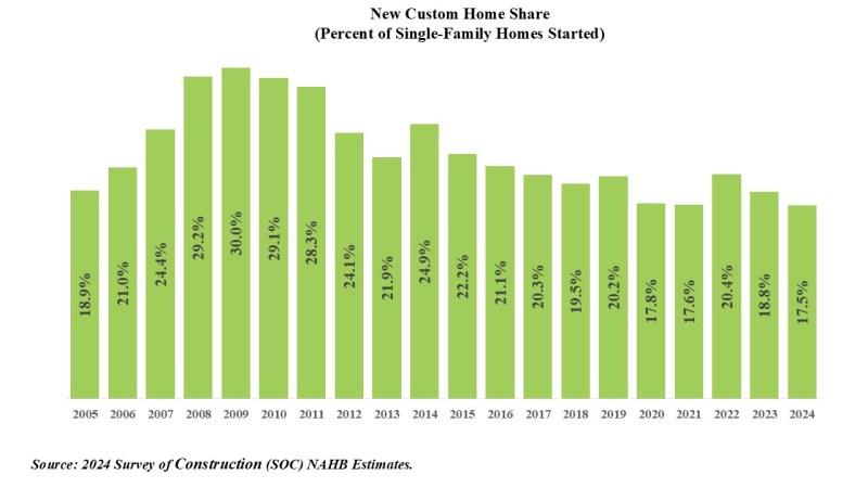 Ashok Chaluvadi2025-10-14T09:20:26-05:00In 2024, 17.5% of all new single-family homes started were custom homes. This share decreased from 18.8% in 2023 and from 20.4% in 2022, according to data tabulated from the Census Bureau’s Survey of Construction (SOC). The custom home market consists of contractor-built and owner-built homes—homes built for owner occupancy on the owner’s land, with either the owner or a builder acting as a general contractor. The alternatives are homes built-for-sale (on the builder’s land, often in subdivisions, with the intention of selling the house and land in one transaction) and homes built-for-rent. In 2024, 73.1% of the single-family homes started were built-for-sale and 9.3% were built-for-rent. At a 17.5% share, the number of custom homes started in 2024 was 176,932, falling from 177,850 in 2023. Quarterly statistics published by the Census Bureau for the second quarter of 2025 show year-over-year growth for custom home building amid broader single-family home building weakness. Although the quarterly statistics are timelier, they are often revised and lack the geographic detail available in the annual data set. When analyzed across the nine census divisions, the annual data show that the highest custom home share in 2024 was 41.2% in the New England division. The lowest share was in the West South-Central division at just 10.7%. Discover more from Eye On Housing Subscribe to get the latest posts sent to your email.