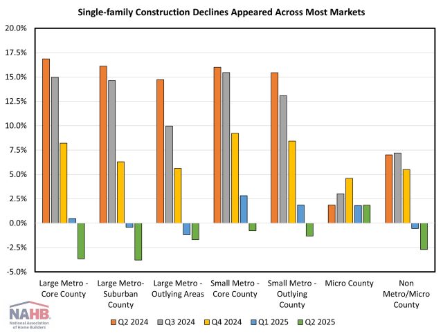Jesse Wade2025-09-02T09:21:24-05:00Single-family construction declined in the second quarter of 2025 for almost all tracked markets, according to the NAHB Home Building Geography Index (HBGI). Meanwhile, multifamily construction continued to expand in low population density markets, which have shown remarkable strength due to for-sale affordability challenges. The HBGI tracks single-family and multifamily permits across seven population density delineated geographies in the United States. Single-Family Home Building Among the HBGI markets, growth in the second quarter of 2025 was only registered in micro counties, which increased 1.8% year-over-year on a four-quarter moving average basis (4QMA). Most markets reported declines, with the largest occurring in large metro suburban counties, posting a decline of 3.8%. The drop in growth across the markets remains high, as five markets had single-family growth near 15% just one year ago. In terms of market share, single-family construction’s largest geography was small metro core county areas, representing 29.3% of single-family construction. The smallest single-family construction market remained non metro/micro county areas, with a 4.3% market share. As the largest declines in single-family construction over the past year occurred in large metro areas, smaller population and less densely populated counties have gained single-family construction market share. The combined market share of these smaller areas (excluding large metro areas), reached its highest level since the first quarter of 2023 (50.3%), marking 50.2% in the second quarter. Multifamily Home Building The largest gains for multifamily construction occurred in small metro outlying counties, growing 22.1% (4QMA) in the second quarter. This was the first time that small metro outlying counties had the largest gain among geographies since the second quarter of 2022, when it rose 29.6%. The largest decline was in large metro core counties declining 12.3%. The market share of multifamily construction for smaller markets has continued to climb since the pandemic. The loss in market share for large metro core counties, which continues to make up the bulk of multifamily construction, has mostly been absorbed by small metro core counties. The market share for small metro core counties is up 4.3 percentage points from the first quarter of 2020 to 24.9%. If this trend continues, small metro core counties could overtake large metro suburban counties for the second highest market share in the multifamily construction market as the gap between the two continues to shrink. The second quarter of 2025 HBGI data along with an interactive HBGI map can be found at http://nahb.org/hbgi. Discover more from Eye On Housing Subscribe to get the latest posts sent to your email.
