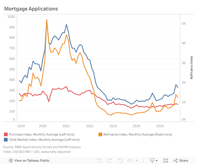 Onnah Dereski2025-11-12T13:14:21-06:00All types of mortgage activity rose on a year-over-year basis in October, supported by recent declines in interest rates. Notably, adjustable-rate mortgage (ARM) applications more than doubled from a year ago, and refinancing activity continued to strengthen. The Mortgage Bankers Association’s (MBA) Market Composite Index, a measure of total mortgage application volume, fell 7.7% from September on a seasonally adjusted basis but was 39.0% higher than a year ago. The average contract interest rate for 30-year fixed mortgages fell 5.4 basis points to 6.37%, the lowest in over a year. Following a strong increase in September, refinancing activity in October dropped 10% month over month, while purchase applications decreased 4.8%. Compared to a year ago, purchase and refinance applications were up 18.1% and 63.0%, respectively. By loan type, fixed-rate mortgage applications decreased 7% from September but were 34% higher year-over-year. Adjustable-rate mortgage applications dropped 13% month-over-month, yet surged 116.5% from a year earlier, following a 124% annual gain in September. As a result, ARMs accounted for 9.44% of total applications in October, one of the highest shares in the past three years. The average loan size across all mortgages was $408,000, down 3% from the previous month. The average purchase loan size remained steady at $437,000, while the average refinance loan size declined 6% to $385,000. For adjustable-rate mortgages, the average loan size fell 5% to $938,000, compared to a 2% decline for fixed-rate mortgages to $353,000.