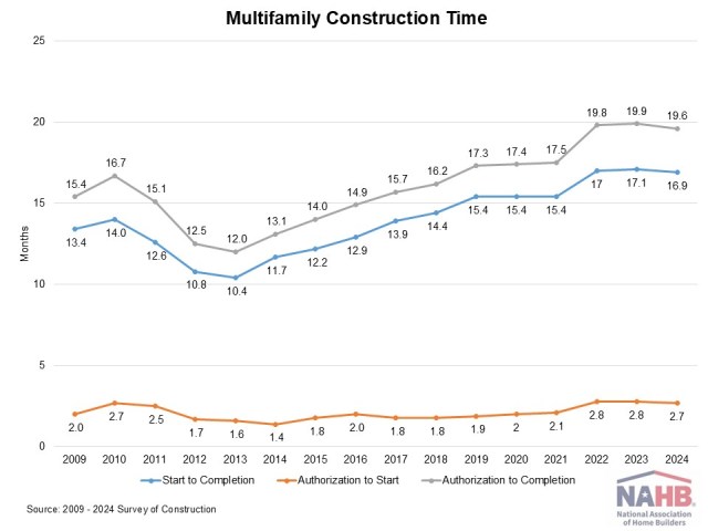 Na Zhao2025-10-06T09:14:42-05:00The average time needed to complete construction of a multifamily building after obtaining authorization edged down in 2024, according to the 2024 Survey of Construction (SOC) from the Census Bureau. On average, it took 19.6 months from permit to completion, about 0.3 months shorter than in 2023. While construction timelines remain lengthy, this modest decline occurred despite the industry continuing to grapple with a shortage of skilled labor. The average time to build multifamily homes varies with the number of units in the building. In general, the more units, the longer the construction time. In 2024, buildings with 20 or more units took the longest, 22.1 months, to build after obtaining authorization. By contrast, 2-to-4-unit buildings were finished the fastest, averaging 15.3 months. Mid-sized projects fell in between, with 10-to-19-unit buildings averaging 19.2 months and 5-to-9-unit buildings averaging 19.1 months. Year-over-year changes show a mixed pattern. Completion times for 2-to-4-unit buildings shortened by 2.3 months, while 10-to-19-unit projects took 2.3 months longer. The biggest increase occurred for 5-to-9-unit buildings, which required 2.2 more months to complete than in 2023. The 2024 SOC data also show a significant regional variation in the average construction duration of multifamily buildings. The Northeast had the longest time from authorization to completion at 23.4 months, followed by the West at 19.9 months, and then the South with 18.5 months. The shortest permit-to-completion period happened in the Midwest with 17.3 months. Discover more from Eye On Housing Subscribe to get the latest posts sent to your email.