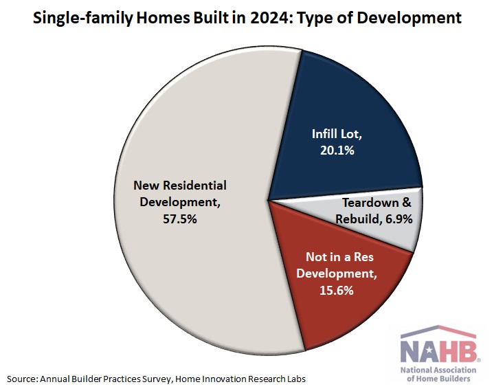 Paul Emrath2025-12-01T10:15:52-06:00In 2024, 6.9% of new single-family detached homes were teardowns (structures torn down and rebuilt in older neighborhoods), and another 20.1% were built on infill lots in older neighborhoods, according to the latest Builder Practices Survey (BPS) conducted by Home Innovation Research Labs. The BPS places new homes in one of four development categories. In addition to teardown and infill, the categories include “new residential development” and ”not in a residential development.” Homes built in a new residential development (i.e., subdivisions) are by far the most common type. There is a moderate amount of geographic variation in the teardown share. At the high end, over one in ten single-family homes were built on a lot where a structure had to be torn down in three of the nine Census Divisions: 15.0% in New England, 13.2% in the Pacific, and 10.1% in the East South Central. At the low end, the teardown share was only 4.8% in the South Atlantic. Nationally, homes built in older neighborhoods, but without tearing down another structure first, were nearly three times as common as teardowns. Again, however, there is geographic variation. Infill development accounted for over 30% of single-family homes in New England (38.0%) and the Middle Atlantic states (32.4%) but accounted for under 10% in the West South Central (9.7%) and Mountain (9.3%) divisions.