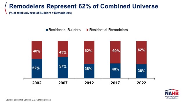 A starker dichotomy emerges when comparing 2022 counts to those in 2007, prior to the financial crisis and the ensuing housing recession. In that 15-year period, the official number of residential remodelers in the U.S. grew by 73% (73,888 to 128,187), while the official number of residential builders contracted by 21% (98,067 to 77,455).