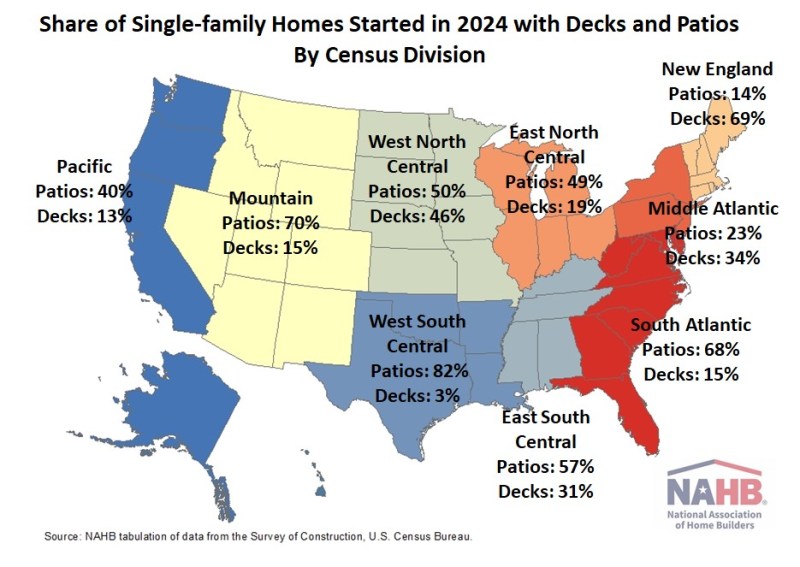 Decks and patios appear to be substitutes across the U.S. On the single-family homes started in 2024, decks tended to be more common where patios were comparatively rare. For example, only 14% of the homes in the New England Census Division included patios, while a high of 69% included decks. Conversely, 82% of new homes included patios in the West South Central, while only 3% included decks. Across all nine divisions, the correlation between the percentages of new homes with decks and patios was -0.77.