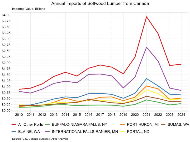 In 2024, Canadian softwood lumber exports to the U.S. totaled $5.1 billion, accounting for approximately 74% of the total value of softwood lumber imports. Canada remains the dominant supplier and a longstanding trade partner in the sector. Trade data from the U.S. Census Bureau enables tracking of import destinations at the state level. The majority of Canadian softwood lumber enters through the International Falls, MN port of entry, which saw $840 million in imports in 2024, which is roughly $150 million more than the next busiest port, Blaine, WA. These figures represent a decline from 2021 and 2022, largely due to lower U.S. lumber prices during the current period.