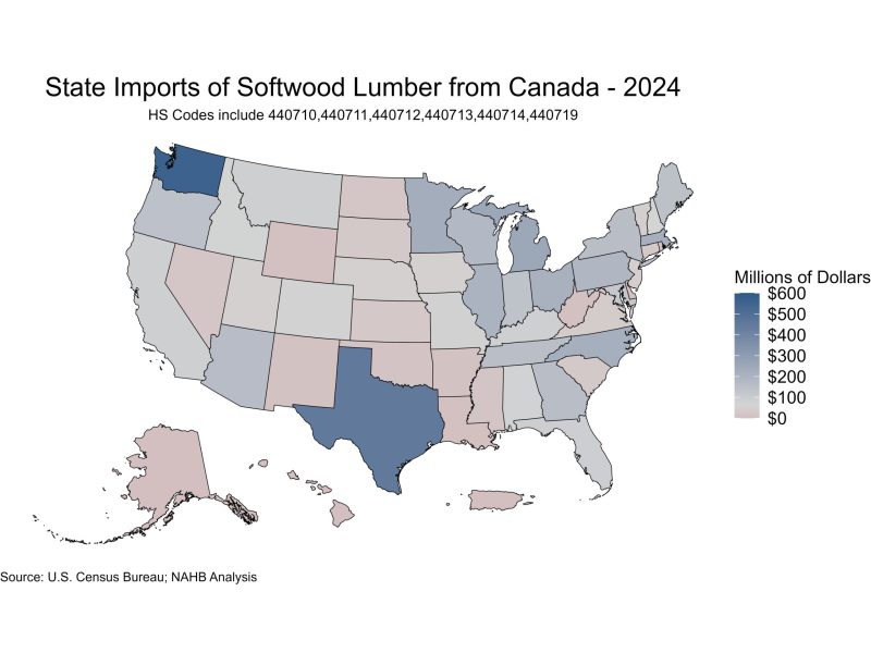 International trade remains a source of volatility across the building materials sector, particularly in the softwood lumber market. Recent adjustments to antidumping and countervailing duty (AD/CVD) rates, combined with the imposition of Section 232 tariffs, have increased the trade-related cost of Canadian imports. As a result, the average duty rate on Canadian softwood lumber entering the U.S. has tripled, now hovering around 45%. These elevated trade barriers pose additional challenges for home builders who rely on Canadian lumber to meet construction demand.