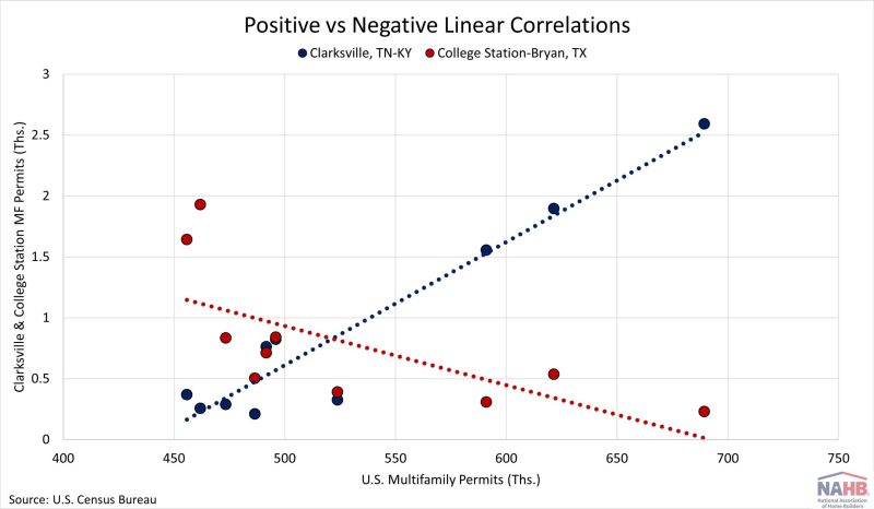 The MSA that had the highest associations with the national trend was Clarksville, TN-KY with a correlation of 0.97, while the MSA that recorded the lowest association with the national trend was College Station-Bryan, TX. The scatter plot below illustrates the linear relationship between these MSAs and the national trend. For example, when national permit levels rose near 700,000, Clarksville (positive correlation) also had relatively high permit levels of around 2,500. At the same time, College Station-Bryan (negative correlation) had relatively low permits of about 230.