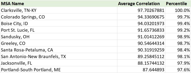 Of the 387 metro areas included in the multifamily MAI, the average correlation is 0.17. In total, 241 MSAs had a correlation greater than zero, and 145 MSAs had less than zero. One MSA had an average correlation of zero (Morgantown, WV), with no multifamily permits in the last five years. A positive correlation is expected as MSAs in total accounted for almost 95% of all multifamily permits in the U.S. on average between 2015 and 2024. A complete list of the MSA correlations is found here and shown on the map below.