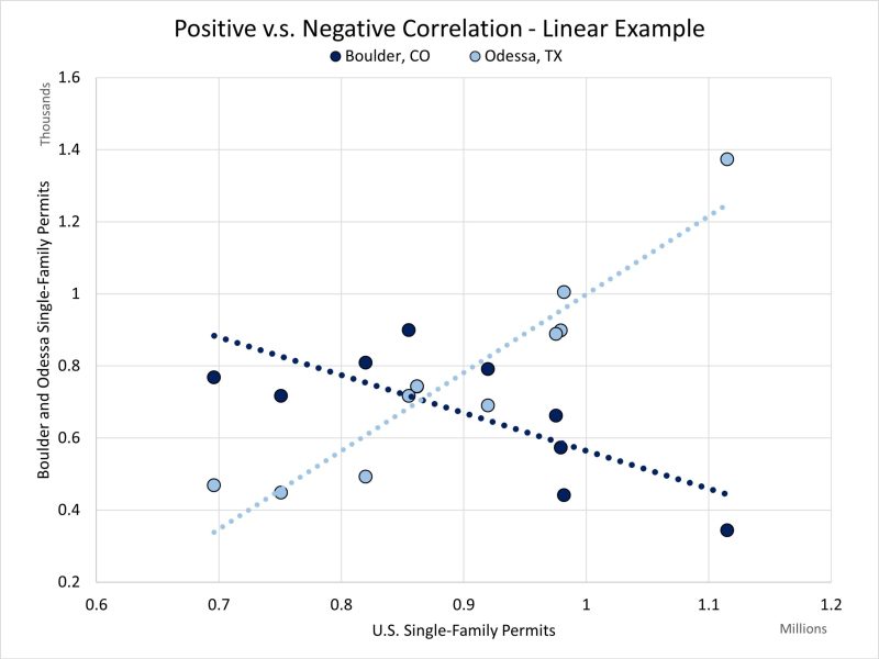 The MSA that had one of the highest associations with the national trends was Odessa, Texas with a correlation of 0.97. Meanwhile, Boulder, Colorado, a similarly sized MSA, had the most negative correlation of -0.81. The scatter plot below illustrates the linear relationship between these MSAs and the national trend. For example, when national permit levels rose toward 1.1 million, Odessa (positive correlation) also has relatively high permit levels of around 1,400. At the same time, Boulder (negative correlation) has relatively low permits, below 400.