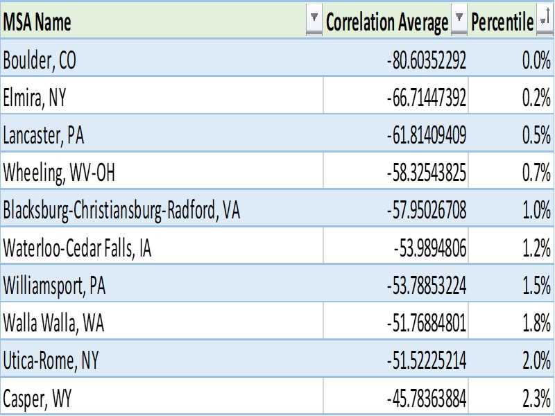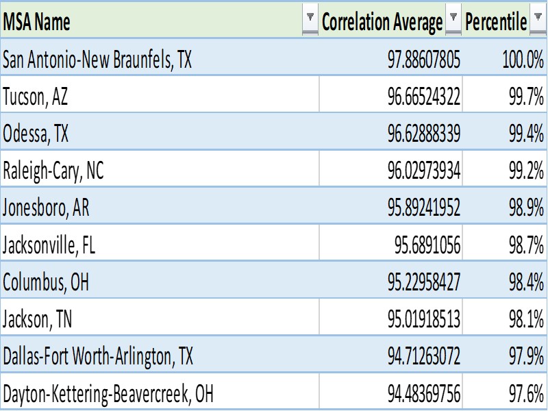 The MAI uses 2015-2024 single permit data to create five- and ten-year correlations for each metropolitan statistical area (MSA), showing their similarity to national patterns. The five- and ten-year correlations are then averaged, with more weight given to the five-year correlation. The resulting correlation coefficient ranges from negative one to positive one, indicating the strength and direction of the relationship between local and national trends.